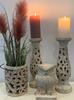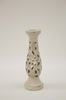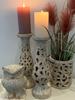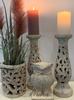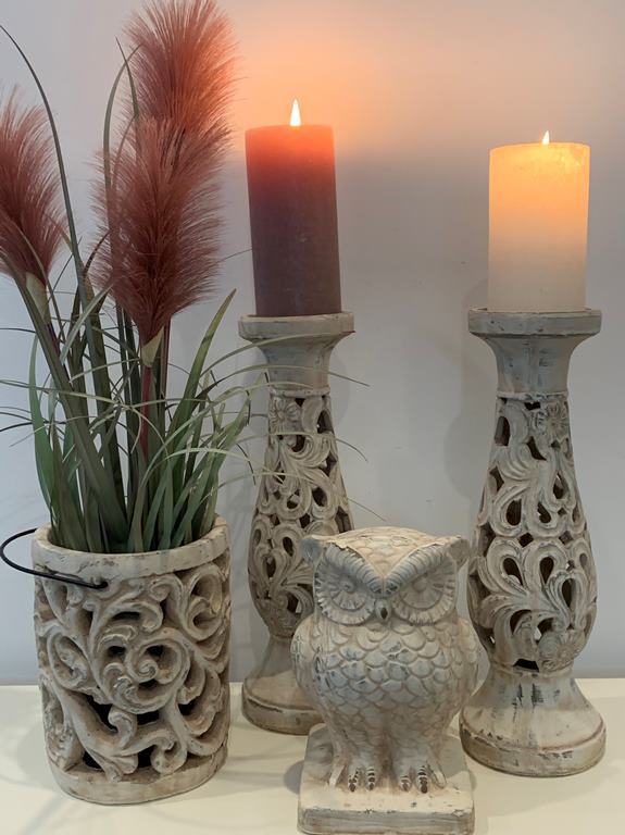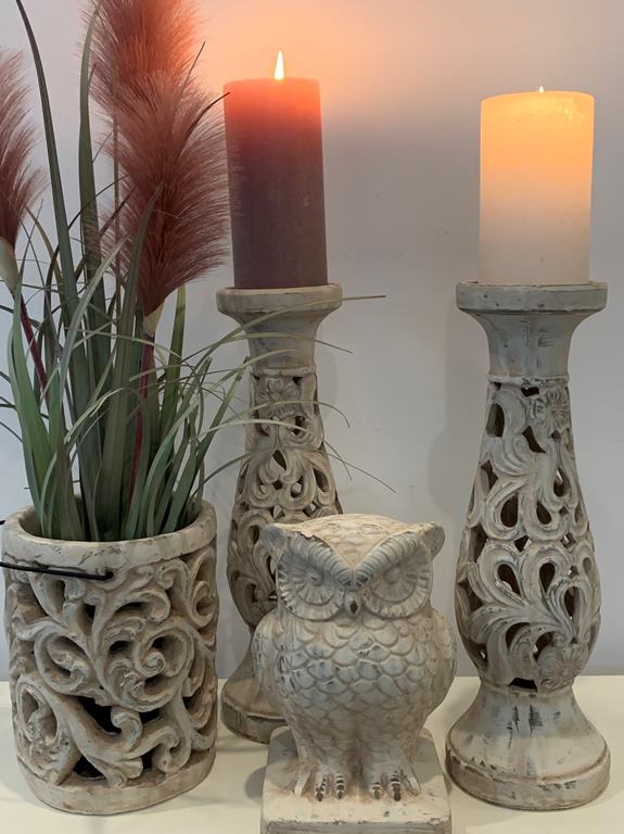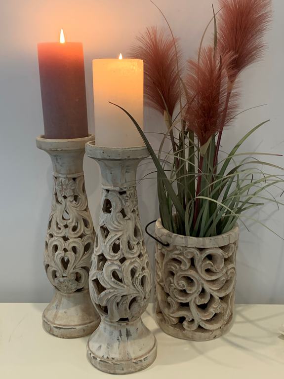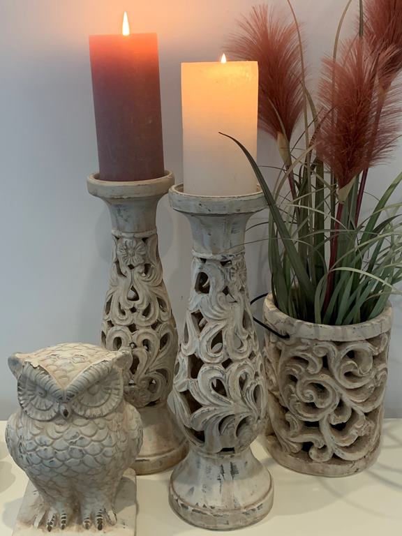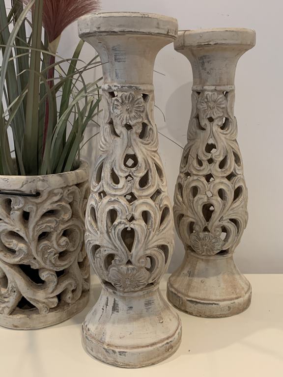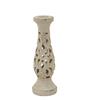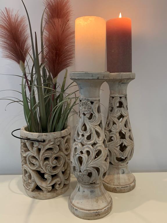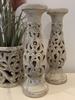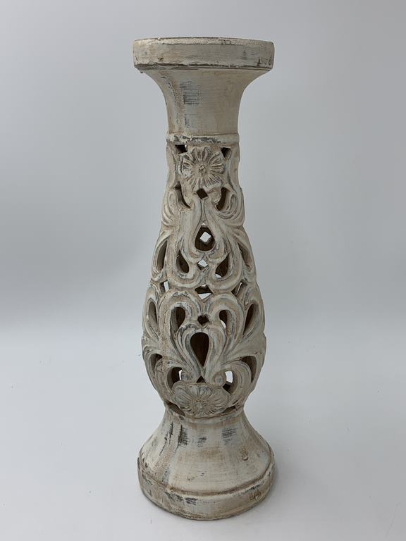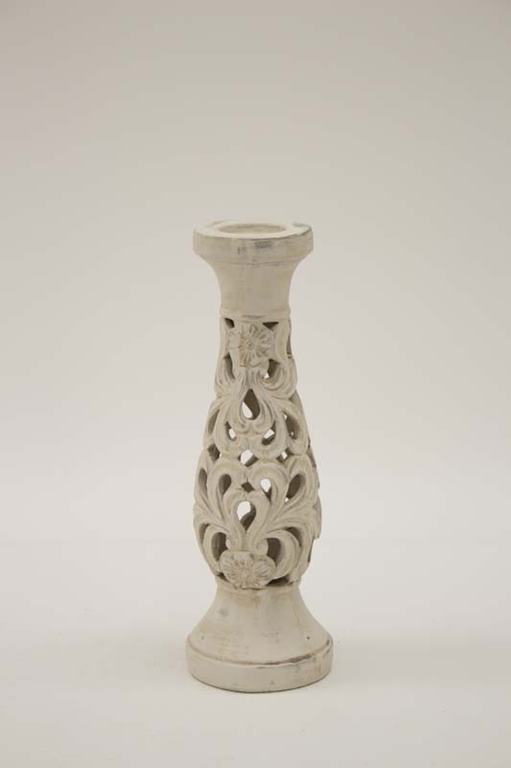 Vysoký, keramický svietnik s krásnym, vyrezávaným vzorom v bežovej pretieranej farbe