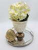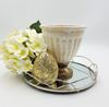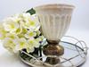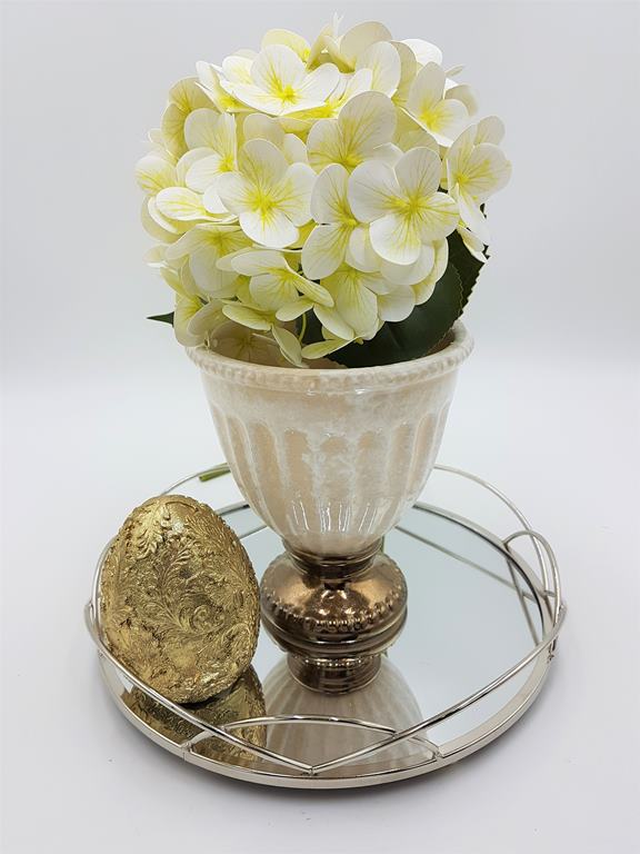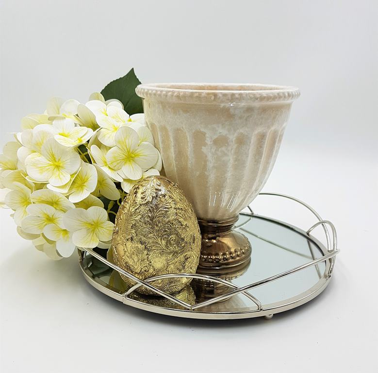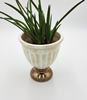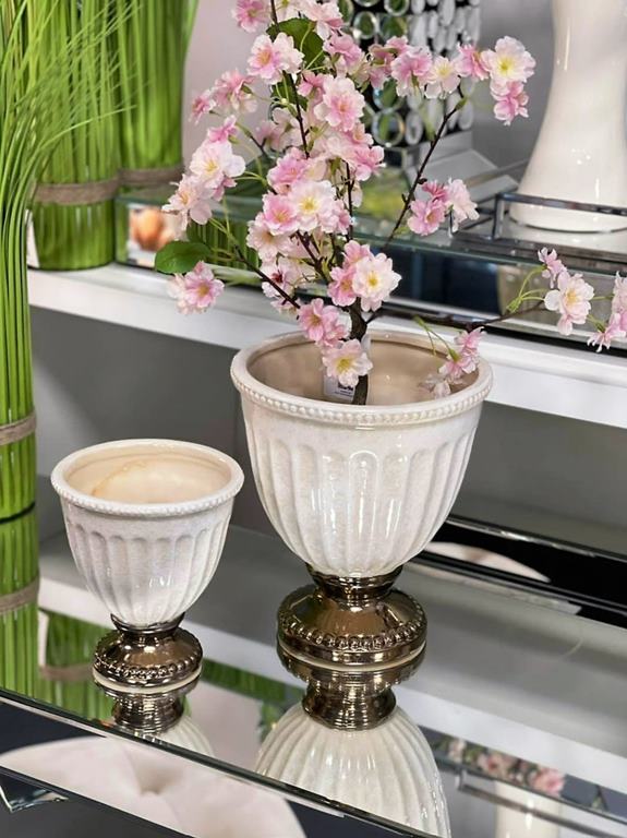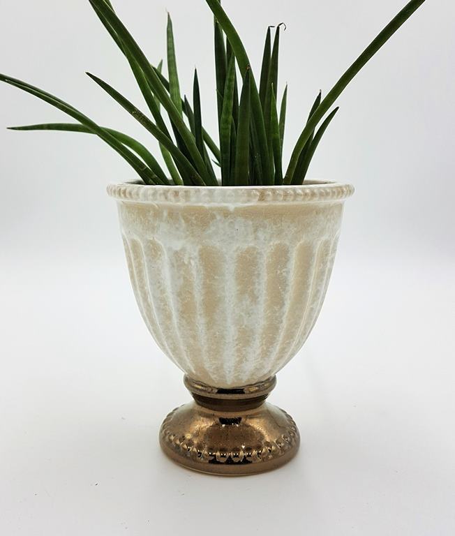 Keramický kvetináč v antickom štýle s lesklou smotanovou glazúrou na zlatej kovovej stopke.