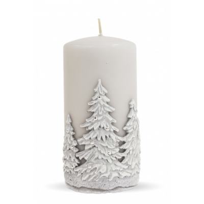 Sviečka so zasneženými stromčekmi v tvare valca. Ručne zdobená striebornými korálkami